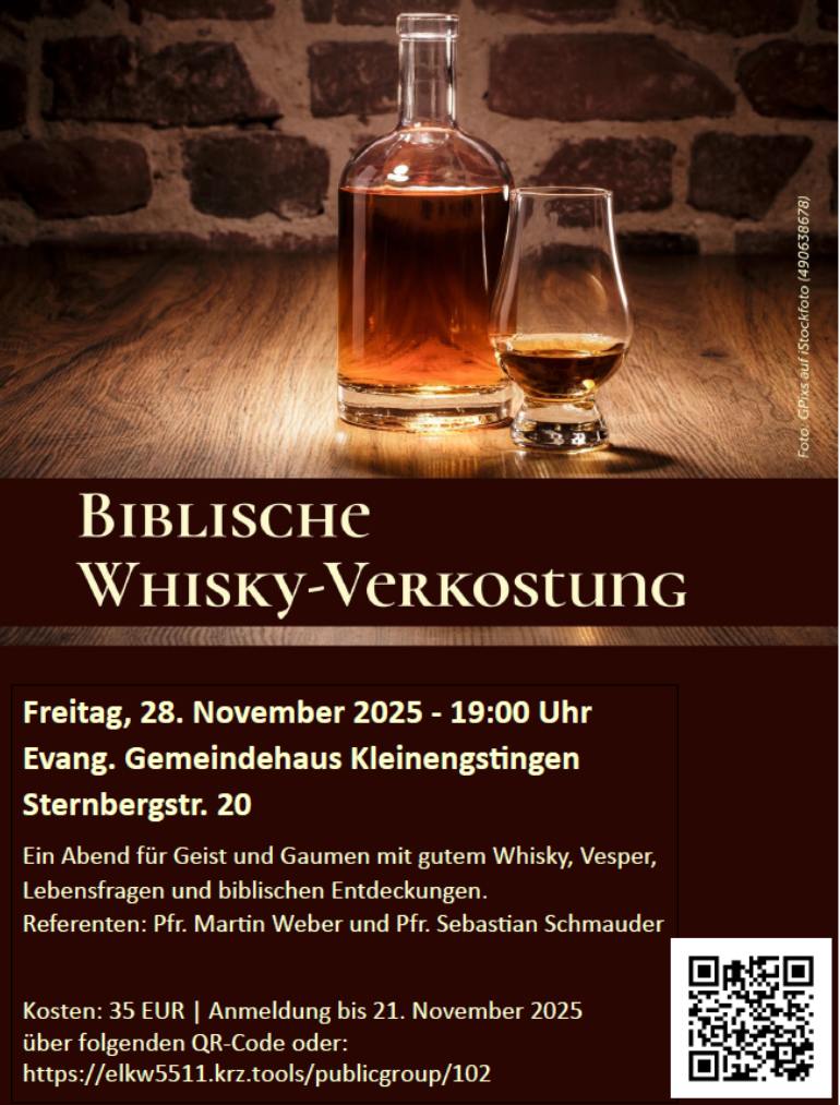 Ein Abend voller einzigartiger Aromen und geistlicher Impulse! Dazu laden wir mit der biblischen Whisky-Verkostung am Freitag, 28. November 2025, um 19:00 Uhr ins Gemeindehaus ein. Unter dem Motto „Whisky trifft Bibel“ bietet der Abend eine genussvolle Möglichkeit, über das Leben und den Glauben nachzudenken. Bei der Verkostung von fünf ausgewählten schottischen Single-Malt-Whiskys erhalten wir Einblicke in die Kunst der Whisky-Herstellung – von den Zutaten bis zum Reifeprozess. Doch damit nicht genug: Gemeinsam wird darüber nachgedacht, was das Leben „gut und reif“ macht. Welche Zutaten braucht ein erfülltes Leben aus biblischer Sicht? Welche Prozesse helfen uns, zu wachsen? Diese und weitere spannende Fragen werden in einer entspannten, offenen Atmosphäre thematisiert. Die Veranstaltung richtet sich an alle, die mindestens 18 Jahre alt sind, und ist ideal für Genießer und Nachdenker gleichermaßen. Neben Whisky werden auch Snacks wie Brot, Brotaufstriche und Haggis und natürlich Mineralwasser angeboten. Die Referenten des Abends sind Pfarrer Martin Weber und Pfarrer Sebastian Schmauder. Die Teilnehmerzahl ist begrenzt.